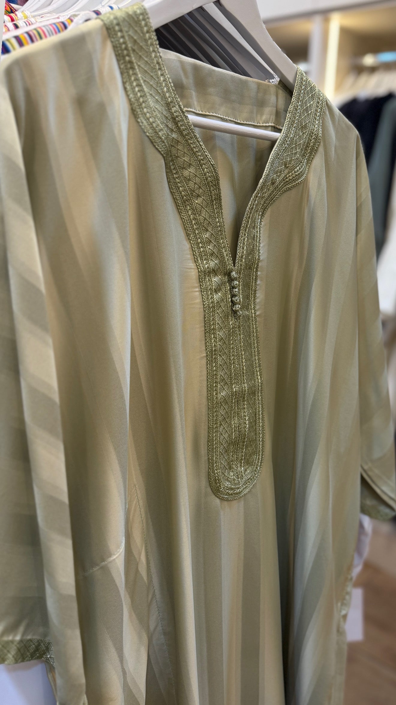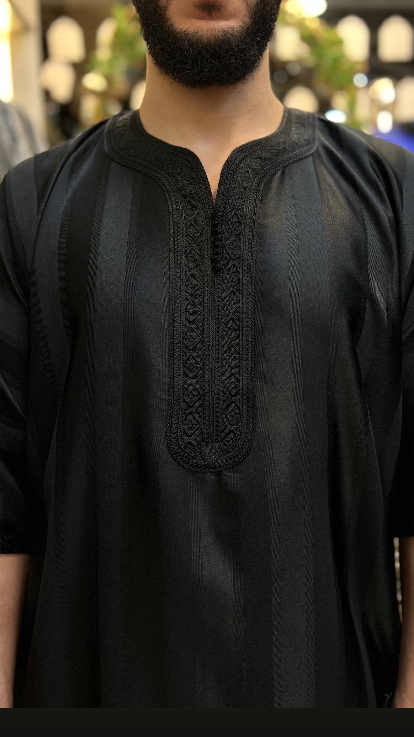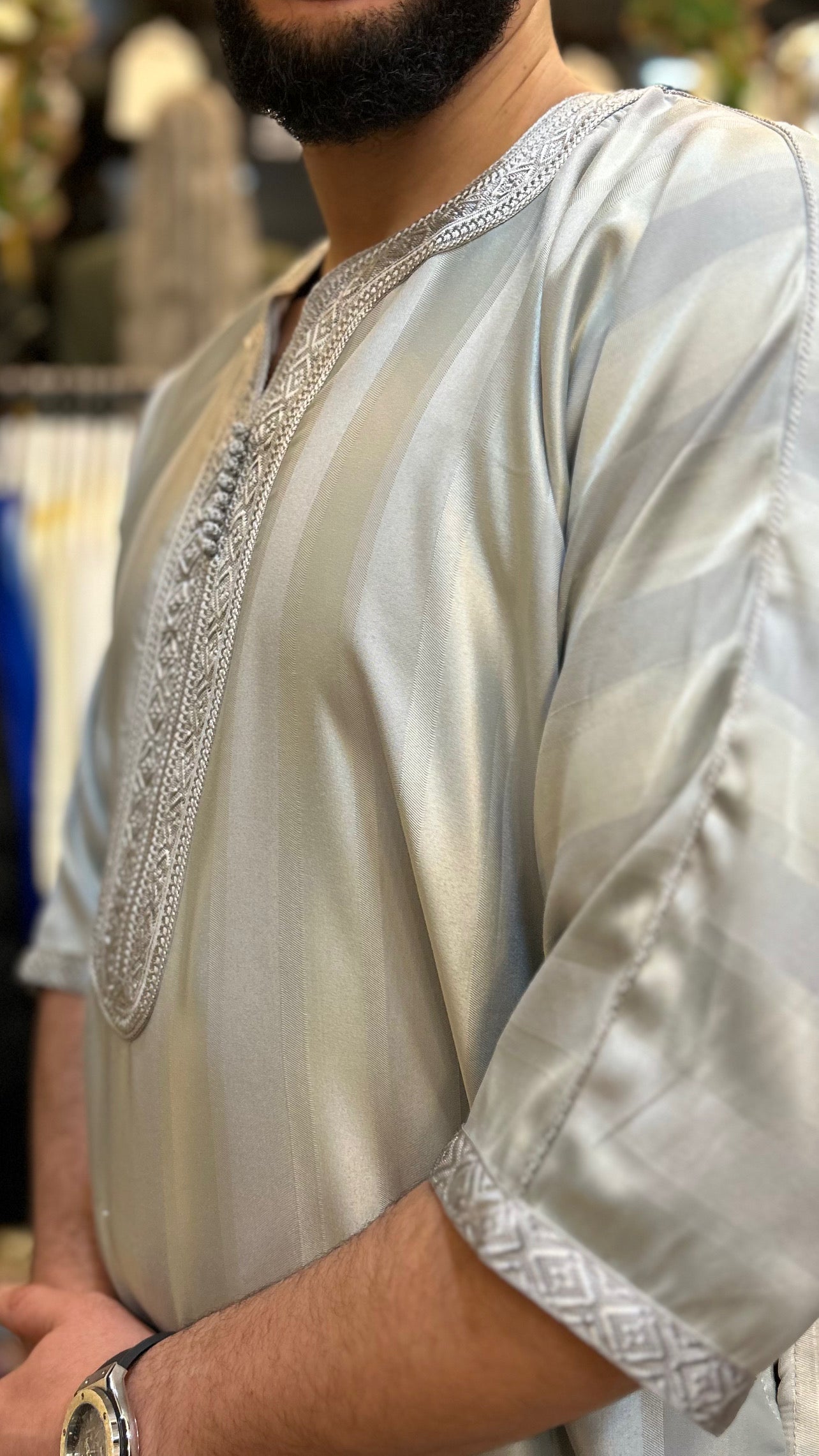 قطعة مميزة: إن الجمع بين الخطوط واللمعان الخفيف يجعل هذا الثوب قطعة مميزة، مما يسمح لك بتقديم بيان أزياء مع احتضان التأثيرات الثقافية المغربية.