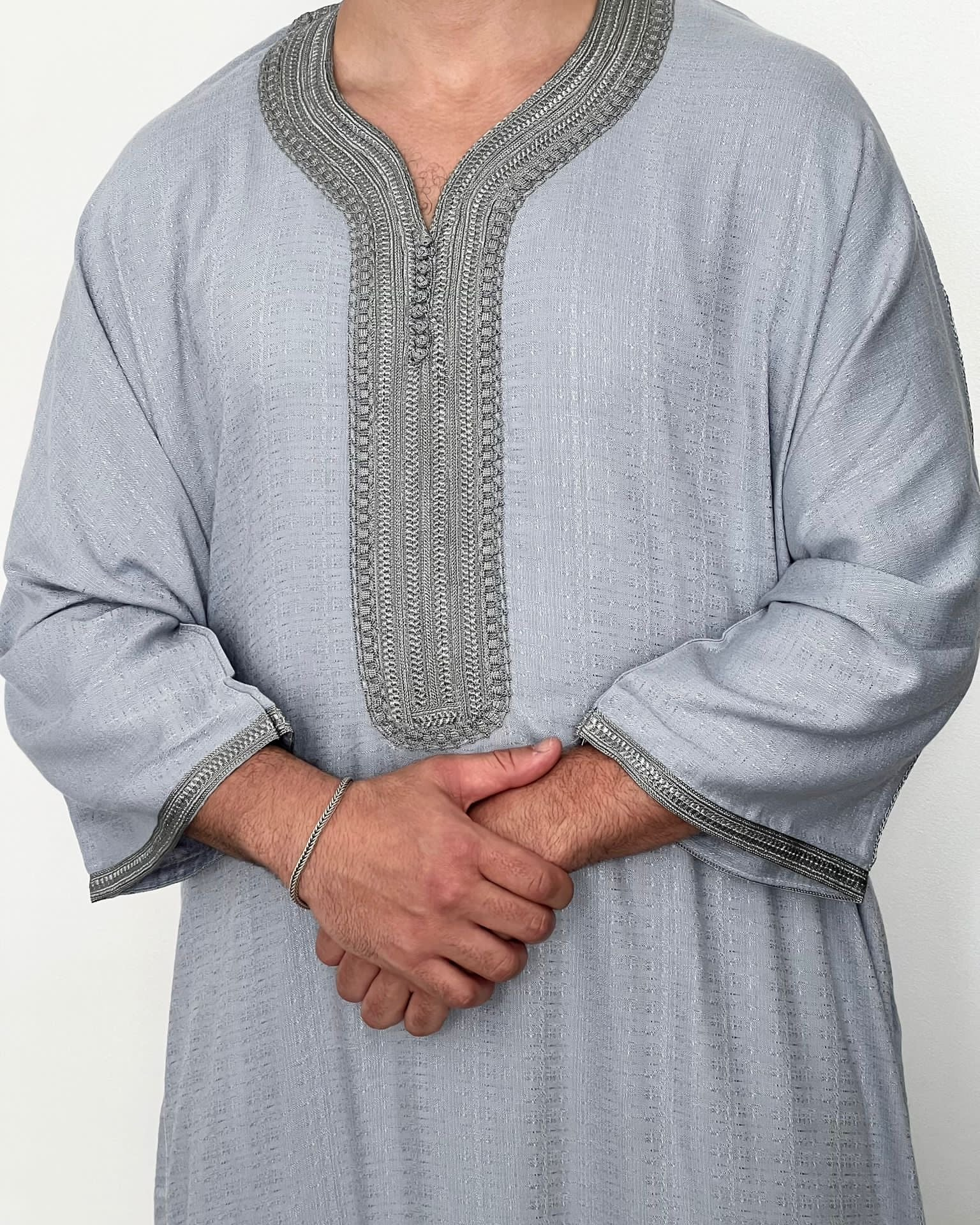 •يرجى ملاحظة: تحتوي جميع أثوابنا المغربية على جيب واحد على *جانب واحد فقط*، وشق على الجانب الآخر للوصول إلى جيب البنطال