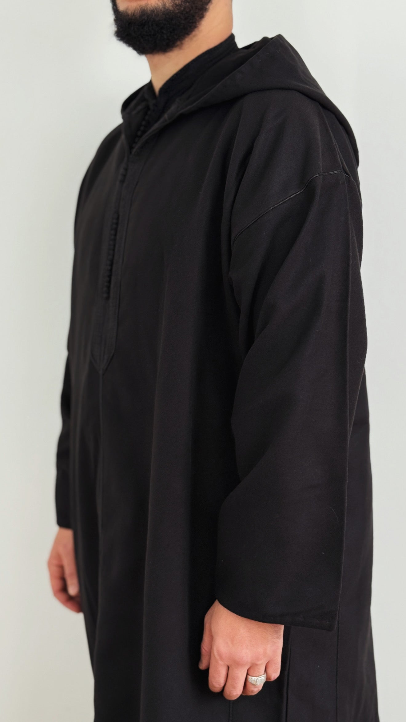 The Traditional Hooded djellaba is a timeless North African garment, perfect for Eid, mosque visits, and family gatherings during the winter weather. Designed for both comfort and cultural authenticity, it features intricate detailing down the middle, shoulders and on the sleeves.