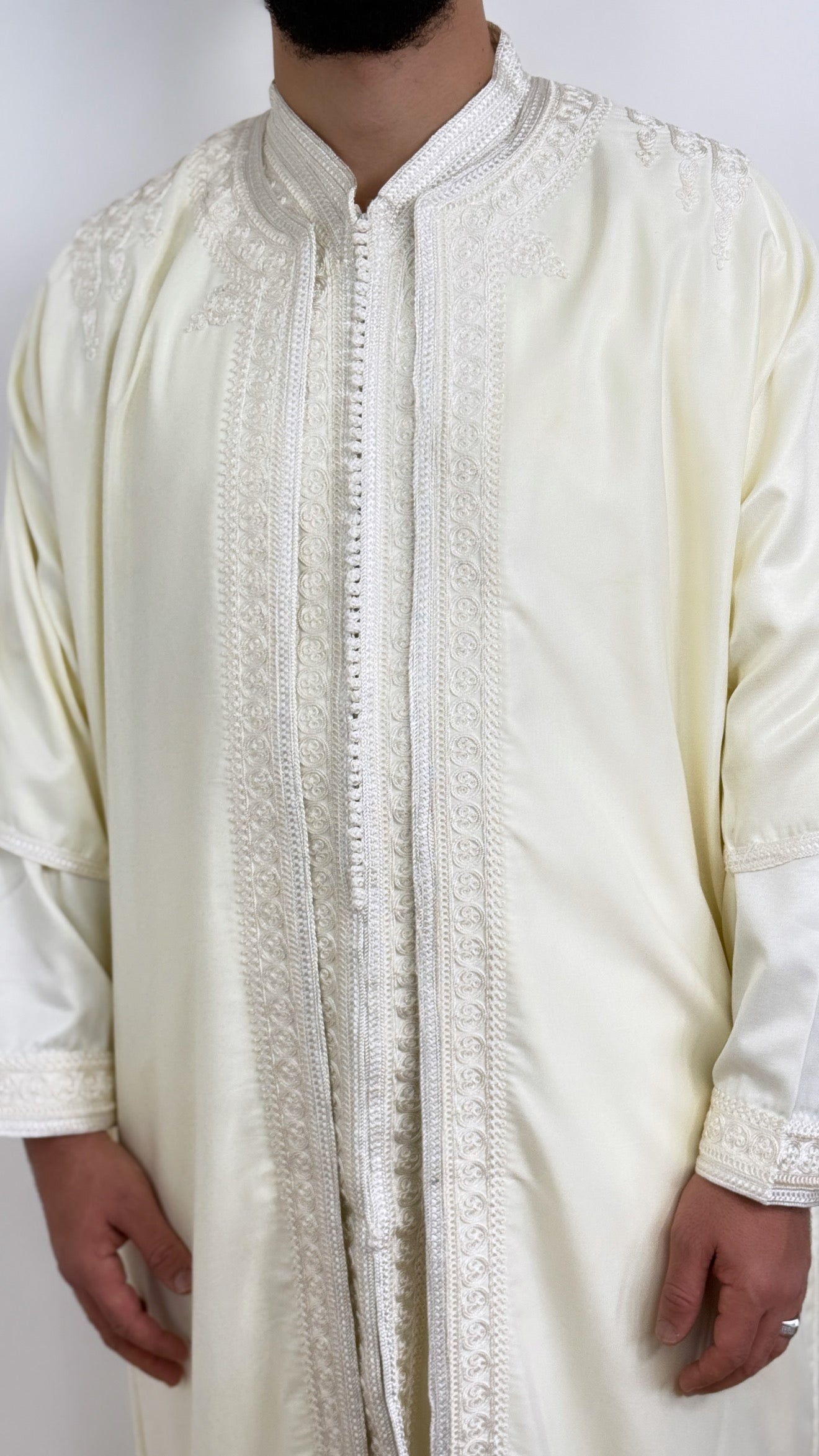 The ensemble features a long-sleeved shirt with bottoms underneath, adding a traditional touch and providing comfort, the top layer with 3/4 length sleeves adds a contemporary and stylish dimension to the thobe. Exquisite embroidery details adorn the outfit, adding a level of intricacy that is perfect for special occasions like nikkah, weddings, and events.