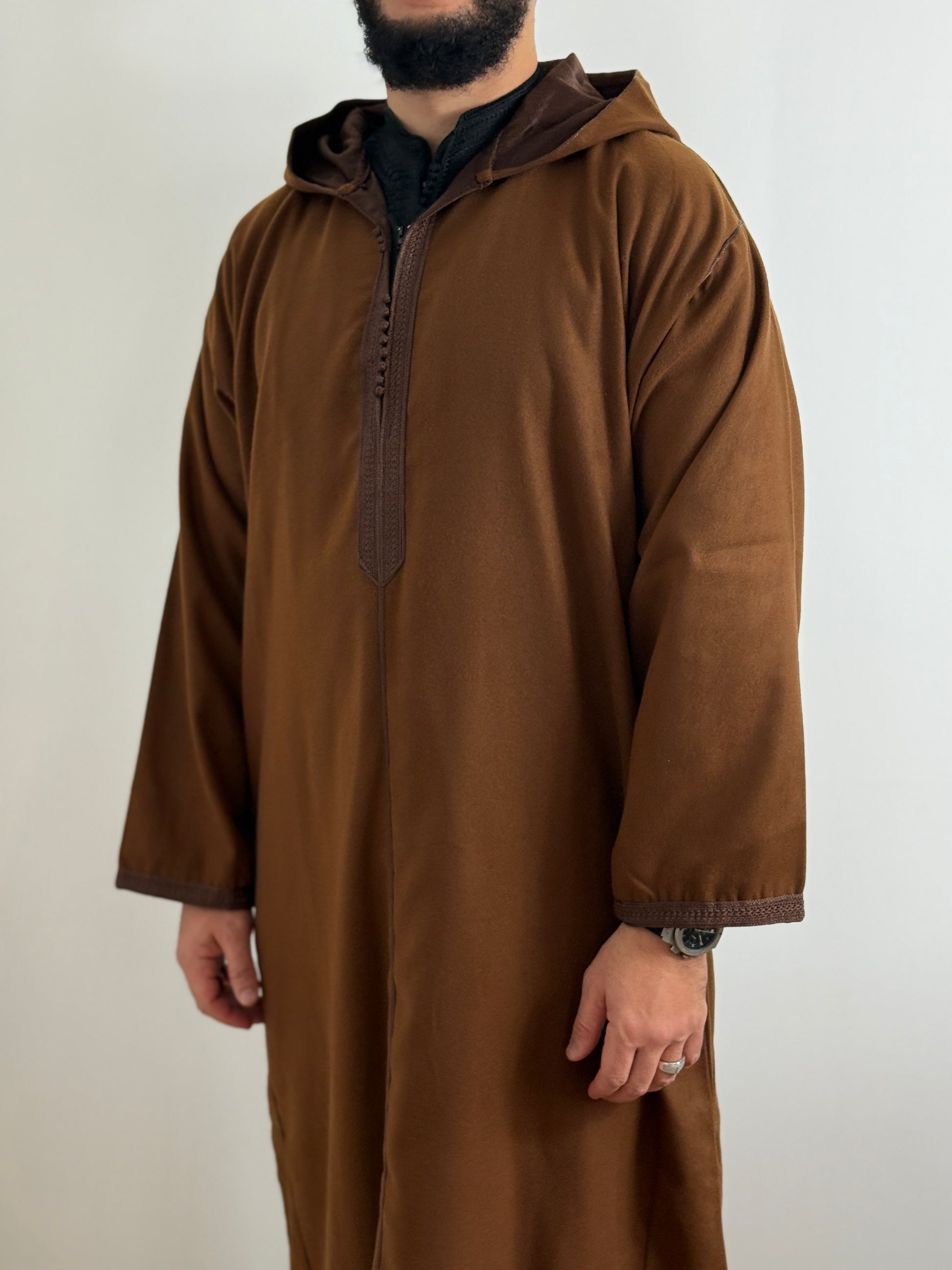 The Traditional Hooded djellaba is a timeless North African garment, perfect for Eid, mosque visits, and family gatherings. Designed for both comfort and cultural authenticity, it features a convenient front zipper along with intricate detailing down the middle and on the sleeves.